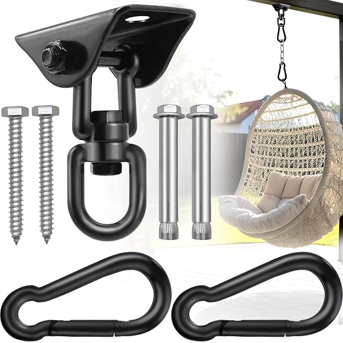 - 360° Free Rotation: Enjoy complete freedom of movement with our 360° rotatable swing hangers. Ideal for hammock chairs, porch swings, tire swings, and yoga swings, these heavy duty swivel swing hanger allow for smooth and unrestricted motion, enhancing your relaxation and exercise experience. Use them with your porch swing rope hanging kit, hanging chair hardware, or ceiling swing mount.