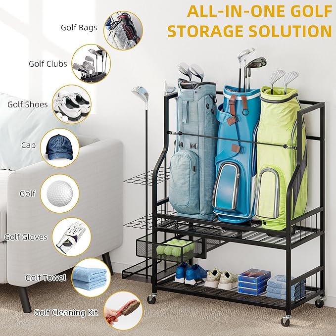 - Comprehensive Storage: Easily store 3 golf bags, 24 clubs, and more accessories in one organized rack. Includes an extra drawer for handy storage of balls, brushes, and other essentials, keeping everything within arm's reach