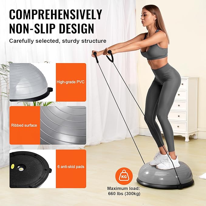 - Premium and Sturdy Construction: This balance ball trainer is made of high-grade PVC material, with anti-skid texture. The non-slip and wear-resistant base paired with 6 anti-skid feet, it enhances stability. Meanwhile, anti-burst technology ensures a safe and worry-free experience from stepping on to plank, lunge to push-up, supporting up to 660 pounds.