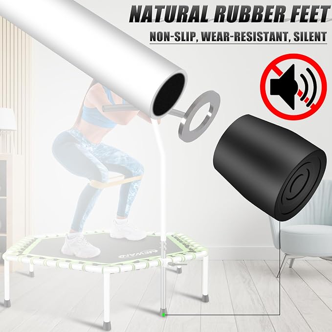 - ✅【Natural Rubber Foot Mats】Newan 8 legs covered with anti-slid rubber cap,There is a little ingenious washer inside the rubber leg caps that keep the leg itself from cutting through the rubber cap after so many uses and body weight pushing down on the metal leg caps and cutting through,make the trampoline reduces noise in maximum extent and more stable grip for safety and non-slip and protecting the floor.It is quiet so You can watch TV while working on the rebounder.