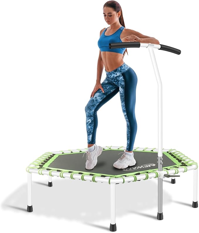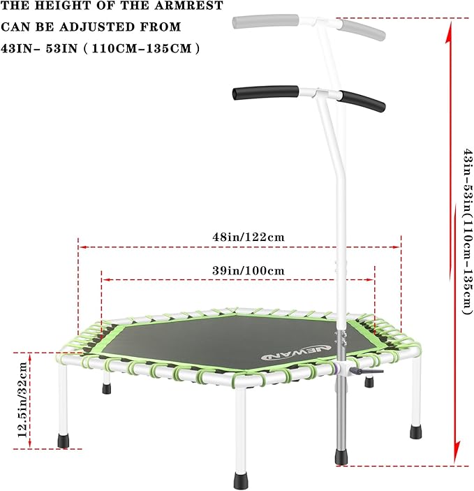 - ✅【Newly Upgraded Handrail】After many tests NEWAN Trampoline perfectly integrates the handrail with stainless steel to make it more stable and solid.The height of the armrest can be adjusted at any height within the 43in-53in (110CM-135CM) range, it can be at any height you want.