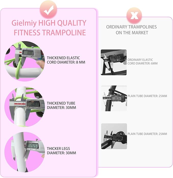 - ✅【HAPPY FITNESS,HEALTHY KNEES】Use a trampoline for fitness, our stretches smoothly further, making you slow down to a soft, almost silent landing on the mat. Highly elastic store the energy absorbed during deceleration and return almost all of them, putting no negative effect on your knees.