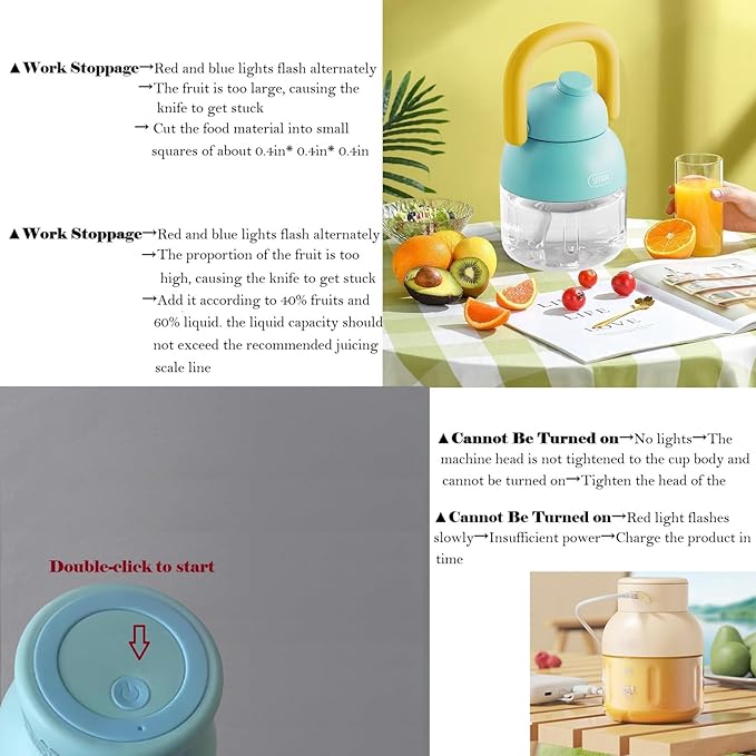 - ♥EXCEPTION AND SOLUTION:①Product Leaks → The silicone ring cannot be assembled into the slot, or the cup body is not tightened→Reinstall the silicone ring and tighten the cup body.②Work Stoppage→Red and blue lights flash alternately→The proportion of the fruit is too high, causing the knife to get stuck→Add it according to 40% fruits and 60% liquid. the liquid capacity should not exceed the recommended juicing scale line(Please see the product description column on the page for details)