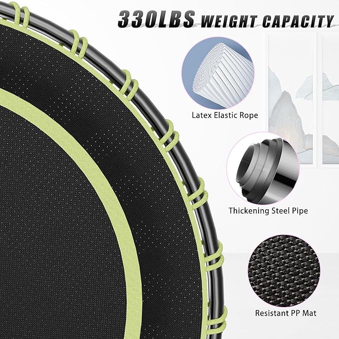 - ✅【Max Load Bungees】:Gielmiy fitness trampoline replaces the rigid, squeaky metal springs with super-elastic bungee rope,Our 30 bungee ball cords have high elasticity,Thicker bungee material is 0.32"(8MM) in diameter, offering better strength in Gielmiy fitness trampoline,reduces noise in maximum extent, affords more stability, and gives you a great jumping experience.user up to 330 pounds(150kg).