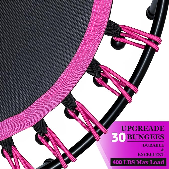- 💪【Stable Structural Design】- This fitness trampoline is made of STRONG PP MESH, anti-wear and tear resistant round rebounding surface, joint-friendly suspension by 30 bungee ropes, thick steel pipe which is 1.5"of the diameter, 6 legs supports user up to 400LBS