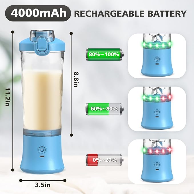 - Portable Design: This on the go blender has a built-in 4000mAh battery and supports USB charging, making it convenient to charge anywhere. This mini portable blender for smoothies and shakes features a lightweight design, making it perfect for travel, the gym, and the office. It's easy to carry and fits in backpacks, gym bags, or car cup holders.
