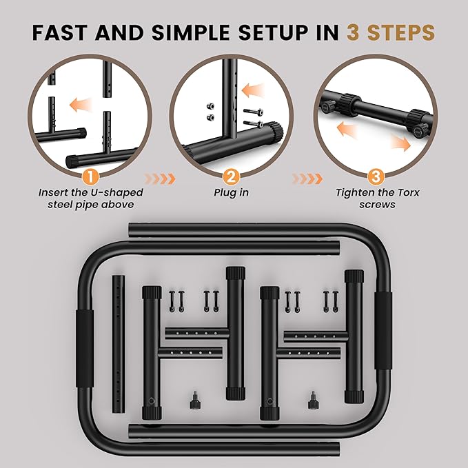 - 【FAST AND SIMPLE SETUP IN 3 STEPS】Assembly is a breeze - most users praise its simple, straightforward setup. Whether you're a beginner or an experienced athlete, you'll quickly be able to seamlessly incorporate this parallel bar stand into your fitness routine.