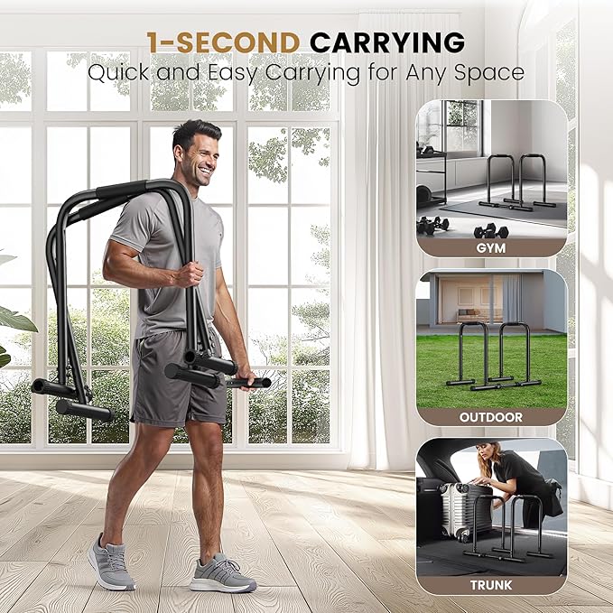 - 【1-SECOND CARRYING】This parallel bar is compact and lightweight, perfect for both indoor and outdoor use. It is easy to carry, you can switch from home to outdoors in seconds, it is your ideal fitness companion wherever you go.