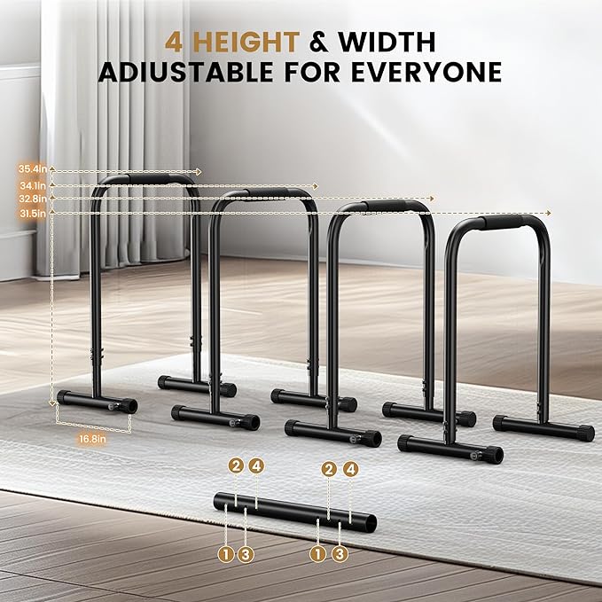 - 【4 HEIGHT & WIDTH ADIUSTABLE FOR EVERYONE】This parallel bar has four height and four width adjustments, so it's easy to customize the station to your needs. Whether you prefer strength training or cardio, this personalization ensures you get an efficient and effective workout.