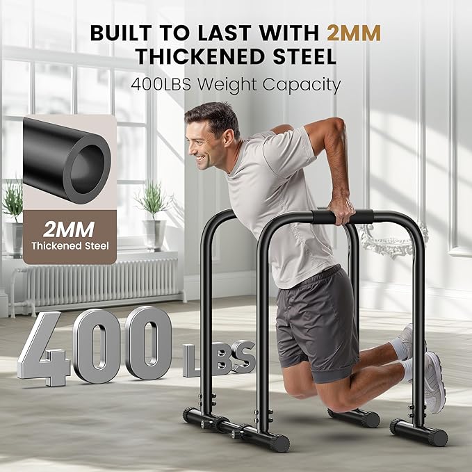 - 【BUILT TO LAST WITH 2MM THICKENED STEEL】Made from heavy-duty steel, the dip station offer impressive durability and can support up to 400 lbs. It is designed for users of all body types and strength levels, ensuring long-term use without worrying about wear and tear or malfunction.