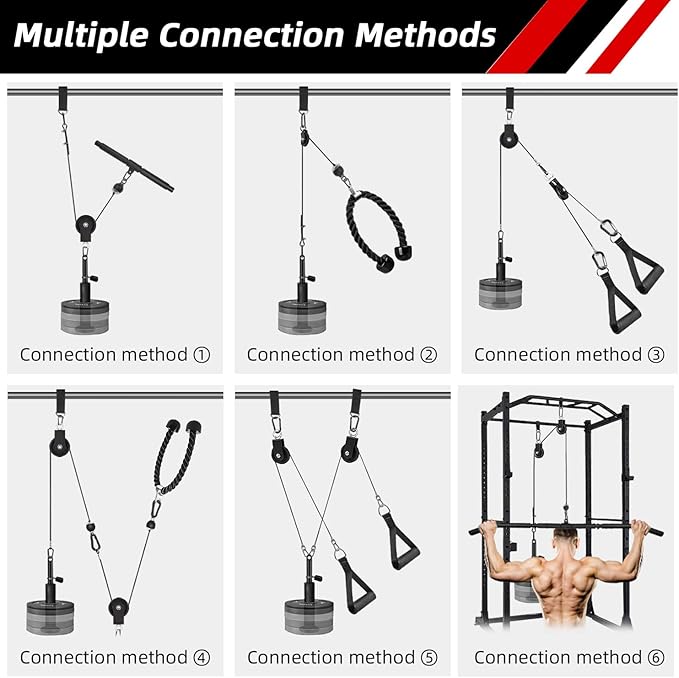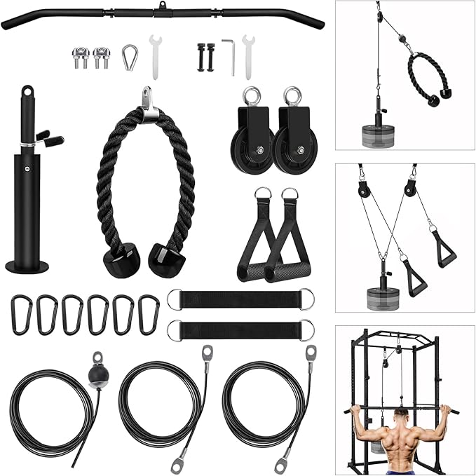 - Multiple Exercise Modes: The upgraded tricep pulley system kit includes more workout equipment attachments, giving you the flexibility to DIY and choose what works for you to complete a variety of workout movements, such as biceps curl, triceps pull down, lat and lift, row, fly, and more.