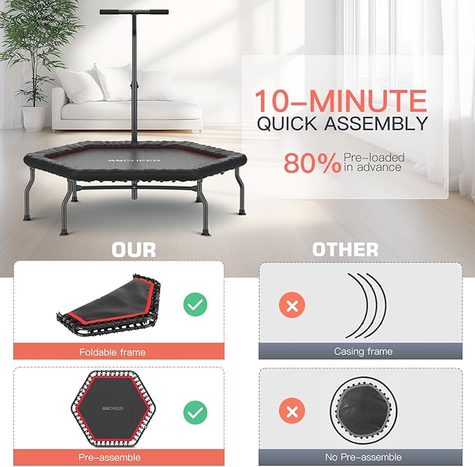- 【EASY ASSEMBLY】ANCHEER Fitness Trampoline 80% comes pre-assembled with the mat secured to the frame with elasticated cords. Each mini trampoline comes with specific assembly instructions, illustrated with detailed assembly steps. The jumping mats are pre-assembled with straps. Assembly takes only 10 minutes with our special tools. You only need to assemble the handles and stand parts for the trampoline!