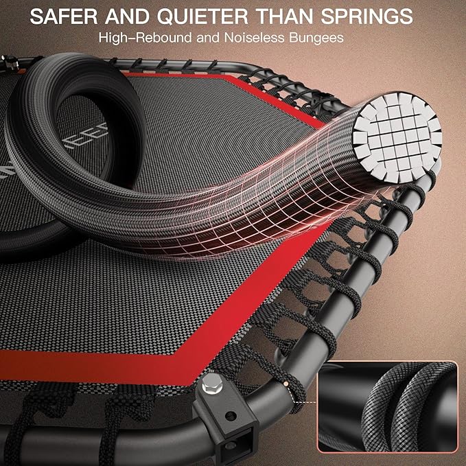 - 【Outstanding Features】Curved Legs Provide Superior Stability - The latest patented design in the mini trampoline industry; Industry-leading bungee technology; 50-inch large hexagonal jumping surface; High-specification steel frame and legs; Sturdy, socketed leg construction for added stability and safety; Ultra-durable, UV-resistant woven polypropylene jumping mats designed to provide comfort and durability; Safe-grip, pressure-reducing foot pads.
