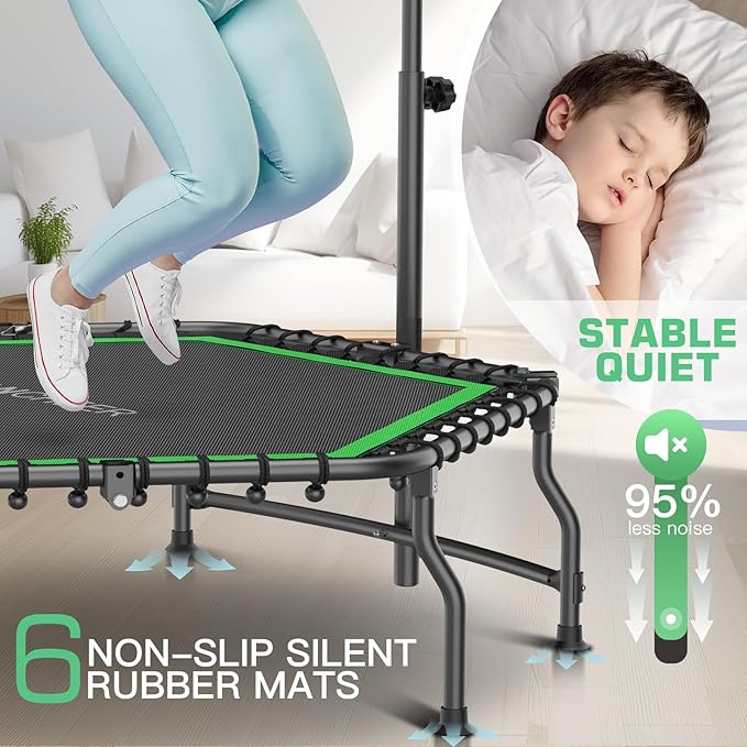 - 【Ultra Quiet】 The 50" mini trampoline features a sturdy bungee design. Say goodbye to the noise of metal springs. We provide you with 6 removable rubber feet to reduce noise, avoid slipping and protect your floor. The included bungee mat outer layer reduces noise and the risk of stepping on bungee cords while bouncing. You can feel that every part of the ANCHEER trampoline has stood the test of time and will last a lifetime.