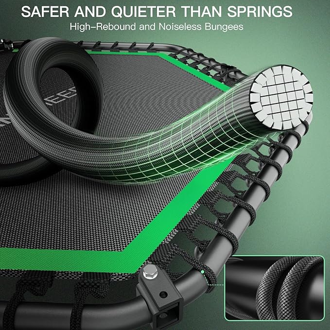 - 【Outstanding Features】Curved Legs Provide Superior Stability - The latest patented design in the mini trampoline industry; Industry-leading bungee technology; 50-inch large hexagonal jumping surface; High-specification steel frame and legs; Sturdy, socketed leg construction for added stability and safety; Ultra-durable, UV-resistant woven polypropylene jumping mats designed to provide comfort and durability; Safe-grip, pressure-reducing foot pads.