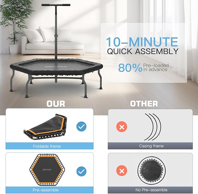 - EASY ASSEMBLY: ANCHEER Fitness Trampoline 80% comes pre-assembled with the mat secured to the frame with elasticated cords. Each mini trampoline comes with specific assembly instructions, illustrated with detailed assembly steps. The jumping mats are pre-assembled with straps. Assembly takes only 10 minutes with our special tools. You only need to assemble the handles and stand parts for the trampoline!