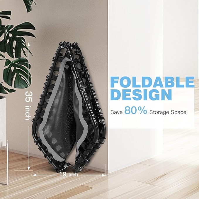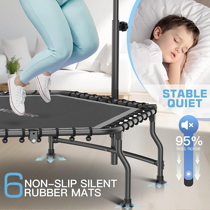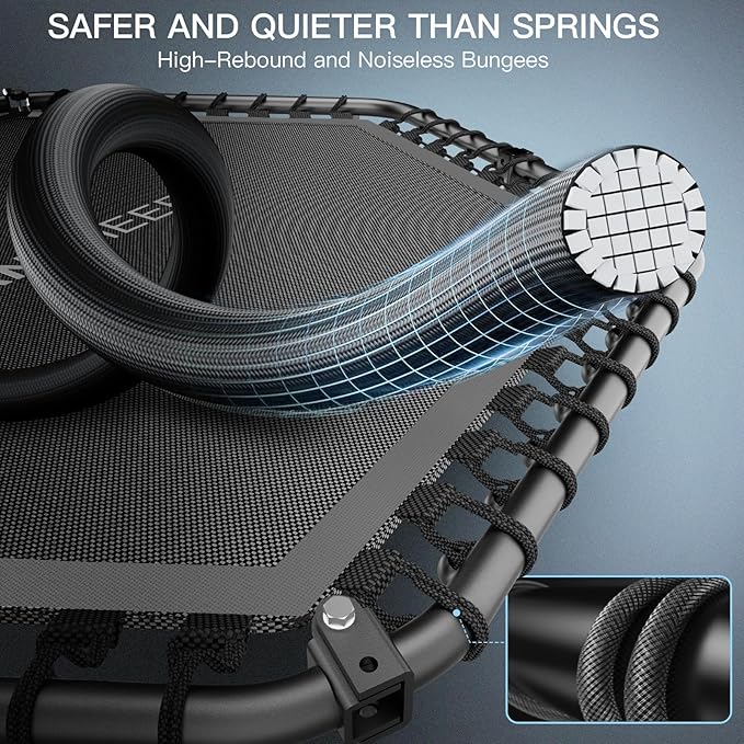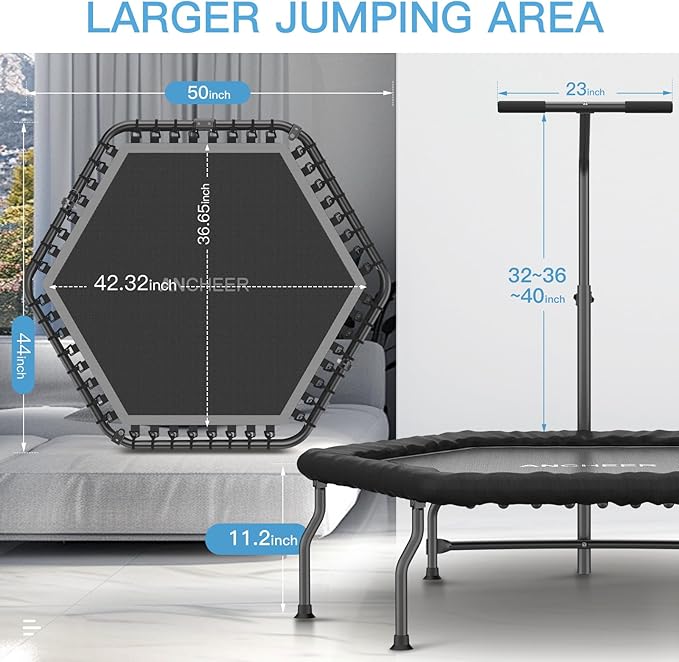 - Ultra Quiet: The 50" mini trampoline features a sturdy bungee design. Say goodbye to the noise of metal springs. We provide you with 6 removable rubber feet to reduce noise, avoid slipping and protect your floor. The included bungee mat outer layer reduces noise and the risk of stepping on bungee cords while bouncing. You can feel that every part of the ANCHEER trampoline has stood the test of time and will last a lifetime.