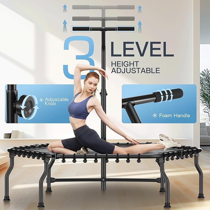 - 3 Levels Adjustable Handle: 3 levels of height adjustable handle (up to 50 inches), suitable for adults and teenagers. Foam-covered handrails prevent sweat from corroding the handles, which enhances balance, flexibility and coordination. Removable handrail bars are designed for easy carrying and storage of the trampoline. Maximum weight capacity 550 lbs.