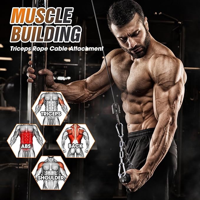 - Triceps Rope Cable Attachment: Not only designed for arms (especially triceps), but also suitable for back, shoulder and other parts of the training. Through a variety of training movements, comprehensively improve the body's strength and endurance, muscle building and shaping