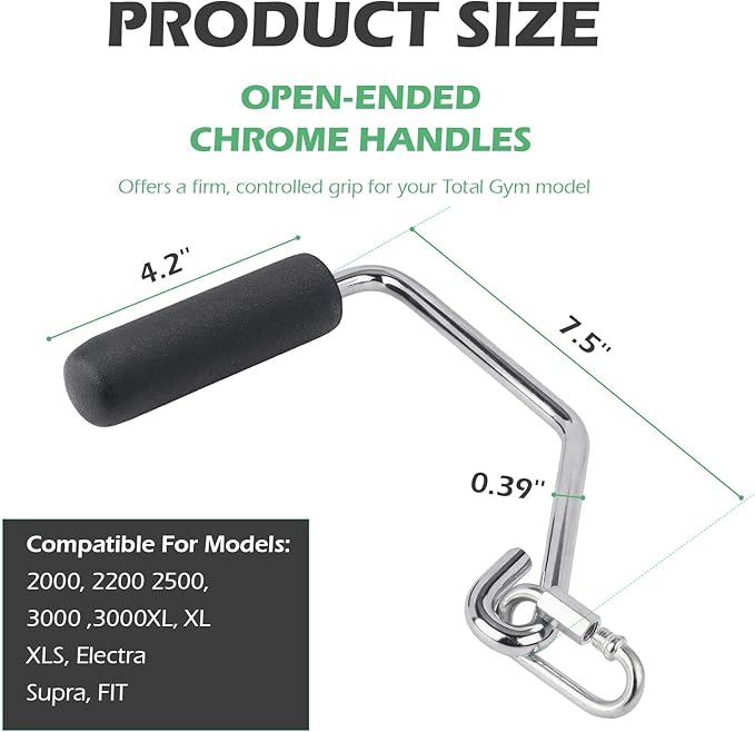 - Universal Compatibility: Open Ended Chrome Grip Handles fou Total Gym parts replacement Models2000, 2200, 2500, 3000, 3000XL, XL, XLS, Electra, Supra, FIT