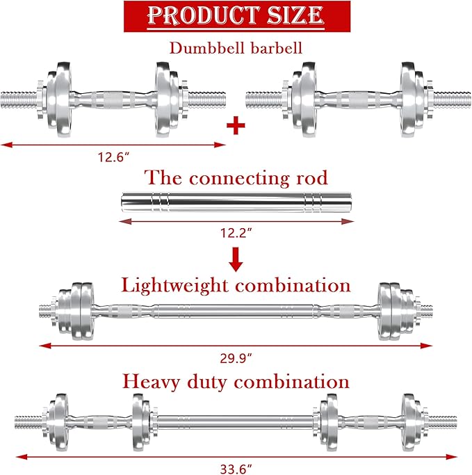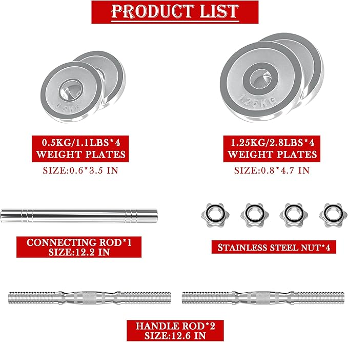 - 【Package List】- Package included 1x connector, 2x dumbbell bar, 4x nuts, 4 x 1.1-pound plates, 4 x 2.8-pound plates.