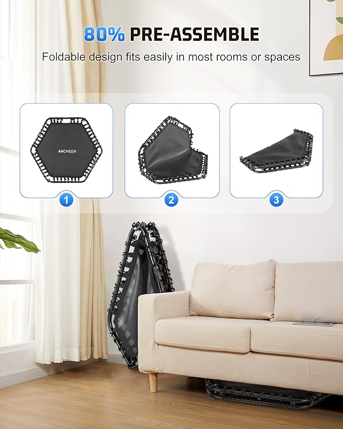 - Advanced Bungee Suspension: 48 Premium elastic cords deliver superior bounce and shock absorption, offering a low-impact, quiet workout experience.