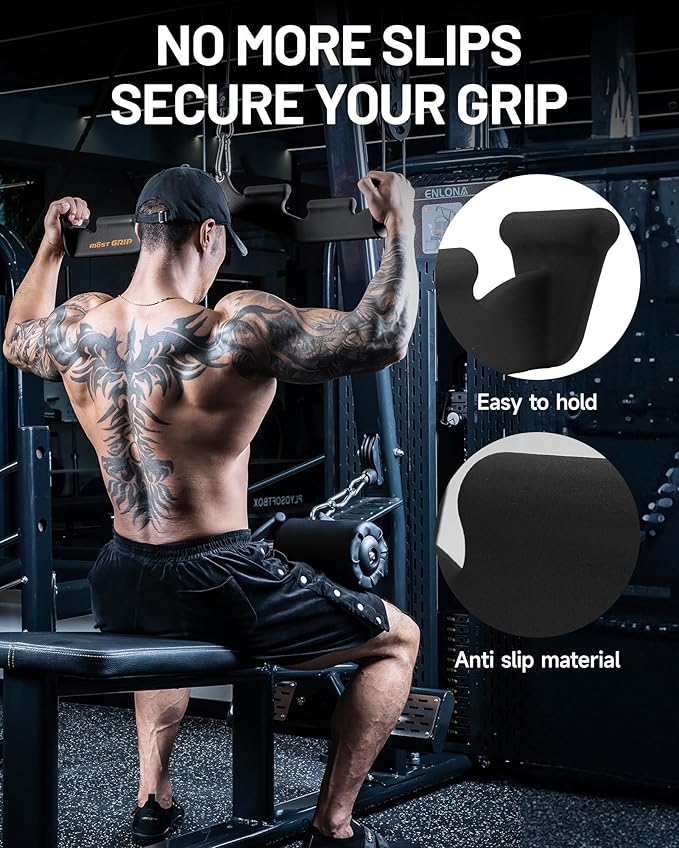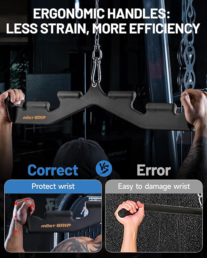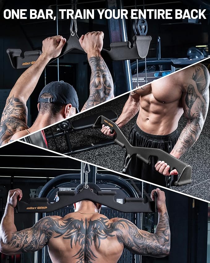 - 💪 Versatile 3-Grip Design for Total Back Development: Maximize your back workouts with the MOST GRIP Lat Pull Down Bar (Registration in process: US 29/959,858). With three grip positions—wide, narrow, and neutral—you can effectively target the lats, rhomboids, and teres for a complete upper body workout. Say goodbye to boring routines! This bar enhances back, biceps, and triceps, giving you a versatile workout in one tool.