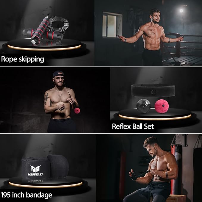 - 【Complete Boxing Equipment】1 x 4ft punching bag(unfilled),1 x 12oz boxing gloves,1 x pair of hand wraps,1 x rotation,4 x expansion bolt,1 x connecting carabiner,1 x boxing bag hanger,1 x jump rope,1 x grip strength trainer,1 x boxing reflex ball
