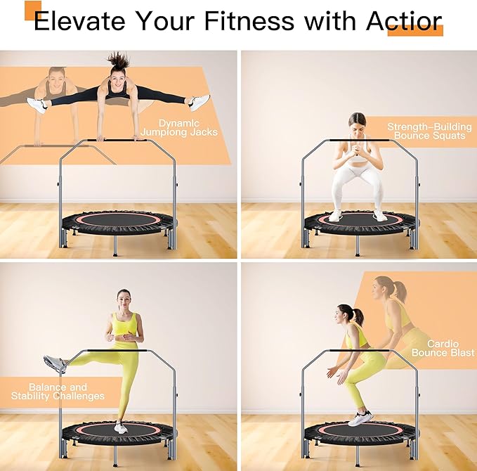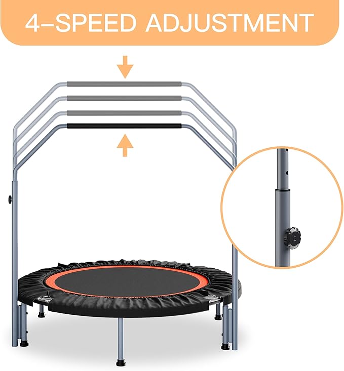 - Adjustable Height Handlebar: The trampoline is equipped with a height-adjustable handlebar that provides stability and support during your workouts. It can be easily adjusted to suit your height and fitness level.