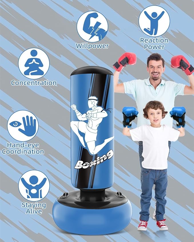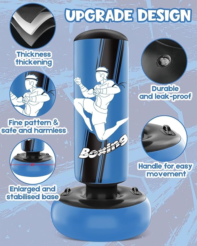 - Dynamic Bounce Back: Featuring three independent air chambers, our kids' punch bag free standing ensures a lively and resilient bounce back, promoting concentration and focus in children while they enjoy a fun boxing experience.