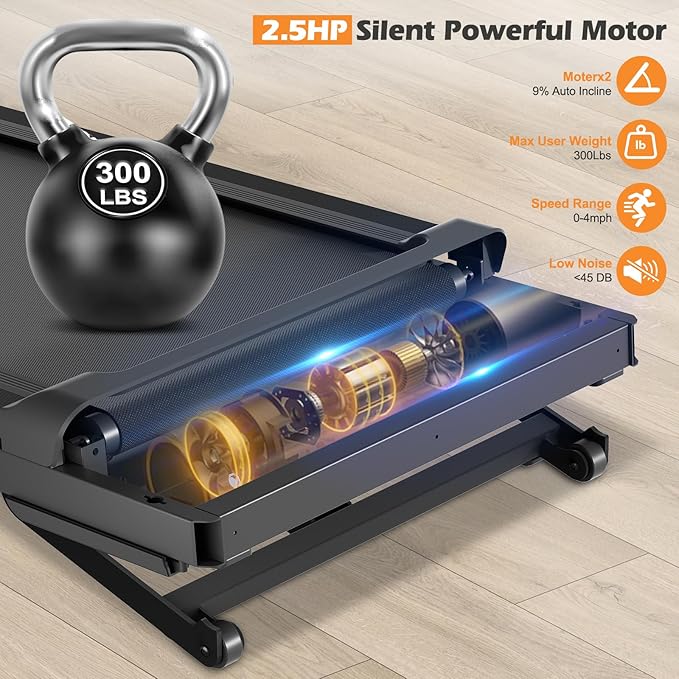 - 2.5HP Powerful and Quiet Motor: The walking pad treadmill with incline is equipped with a powerful 2.5HP motor while keeping the operating noise below 45 db, hold up to 300 LB weight capacity, offering a speed of 0.6-4 mph, allowing to start with a comfortable pace and gradually increase it to more intense walk