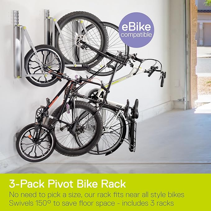 - 3-Pack Pivot Bike Rack: This garage bike rack offers a full 150 degrees of swivel in both directions, providing hassle-free access to your bikes while maximizing floor space. International Houseware Association Gia Global Innovation Award winner.