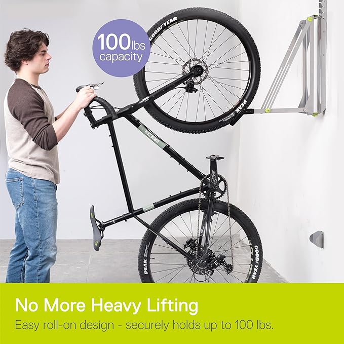 - Effortless Bike Loading: Say goodbye to heavy lifting. Our wall bike rack's roll-on design lets you easily store bikes without the back strain. Securely holds most bikes, including ebikes up to 100 lbs.