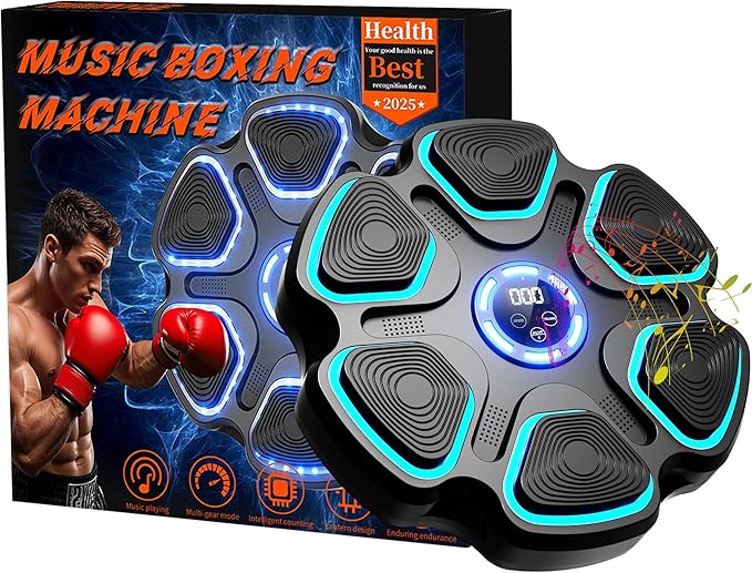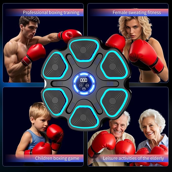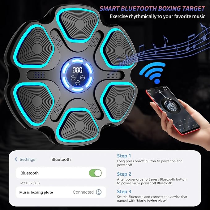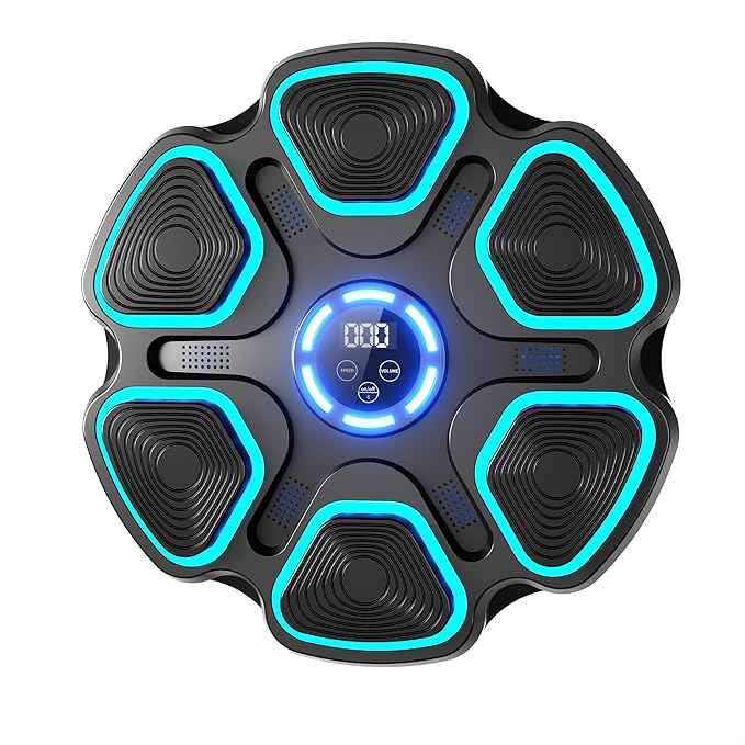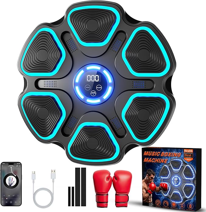 - 【Beat-Driven Workouts】Sync your music boxing training via Bluetooth – the musical boxing machine plays your playlists through built-in speakers during training. Dynamic LED lights react to punches and songs, creating immersive rhythm-based workouts. The boxing machine for adults features a clear display showing hit counts and progress streaks, turning exercise into a gamified experience.
