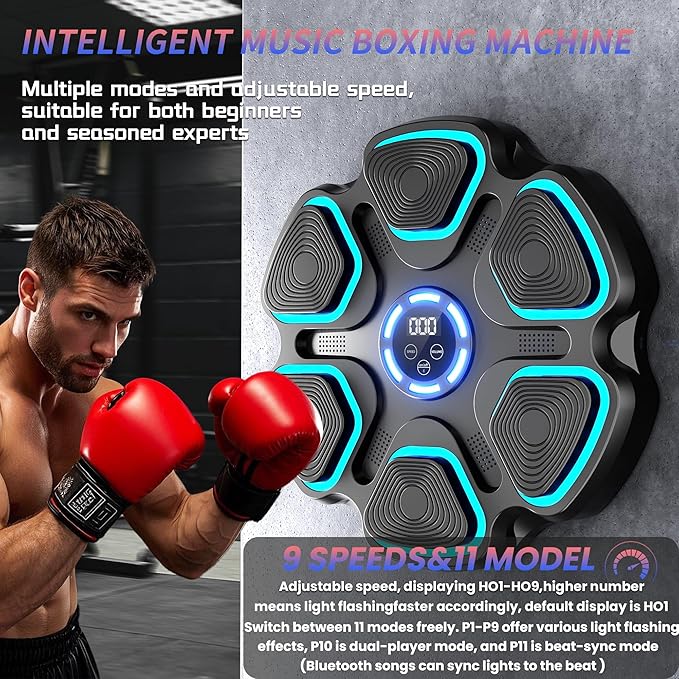 - 【Adaptive Training Modes】This music boxing machine offers 9 speeds&11 Models for versatile boxing training. Beginners and experts can customize difficulty through quick-press controls short tap for modes, The smart punching machine’s LED targets improve coordination by lighting up strike zones, while its counting system tracks punches in real-time. Perfect for adults, kids, office workers, or fitness enthusiasts aiming to boost reflexes and stamina.