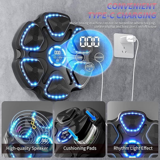 - 【Type-C fast charging&Easy to Install】This innovative music punching machine features Type-C fast charging and smart hit-count tracking to monitor workout progress. using included adhesive strips or Velcro, letting you build a home boxing gym without damaging walls,Smart Music Wall Boxing Punching Pad Perfect for busy adults, kids, or fitness enthusiasts seeking fun cardio sessions at home - skip expensive gym fees and upgrade your stamina through rhythmic music-guided workouts.goal.