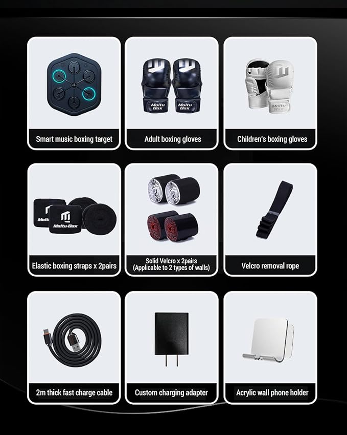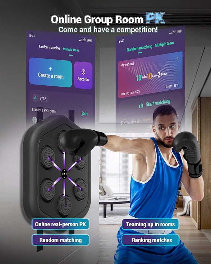 - Smart Interconnectivity: Control your workout with the Maitubox app, it integrates music switching, data tracking, and social competition in one place. Built-in professional sports algorithms record punch speed, frequency, and calorie consumption in real time, generating personal training reports. The unique "Global Arena" mode allows users to challenge others online, fueling competitive spirit with leaderboards. You can also use touch machine screen controls to play built-in music.
