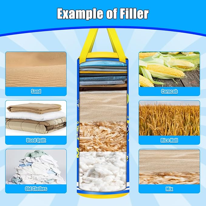 - Boxing Equipment for Kids: The 2ft unfilled boxing bag for kids is easy to carry and store. You can fill it with sand, old cloth, sawdust, shredded cotton fabric, soybean, corn, sponge and so on. But please don't just fill it with sand, the filler should preferably be no more than 44lbs.