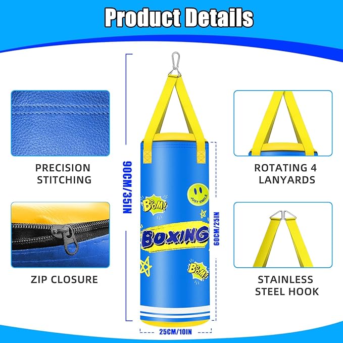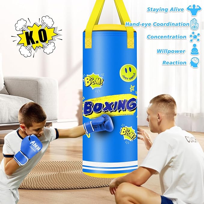- Ideal Kids Boxing Gift: This hanging punching bag for kids can training tawekwondo, karate, kicking, helps children improve strength and power, practice reflexes and hand-eye coordination, build up cardiovascular endurance, improve coordination and reduce stress.