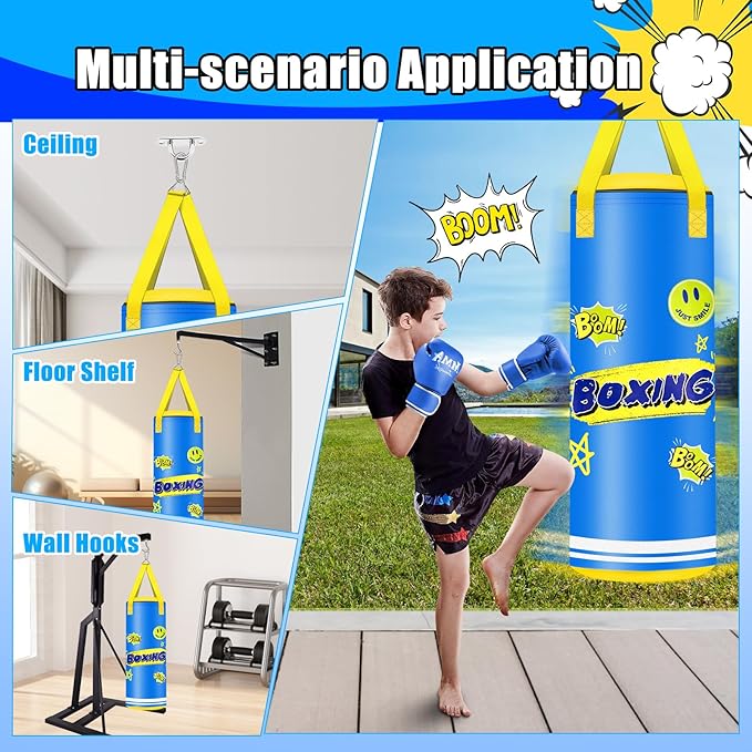 - 6oz Kids Boxing Gloves: This punching bag for kids 8-12 come with boxing gloves for kids, which are made of extra thick foam cushion and wear-resistant pu leather design. Thickened cushioning and breathable mesh, absorb impacts & providing comfort, comfortable to wear and safe not to hurt your child's hand.