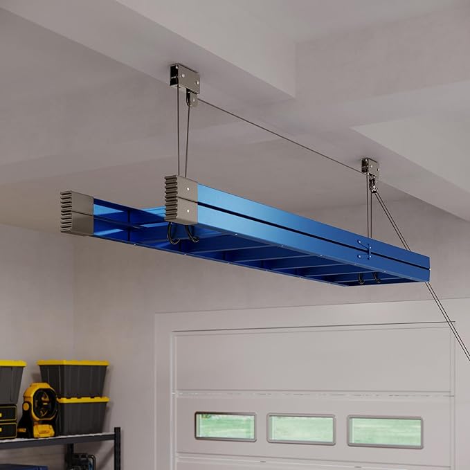 - EASY INSTALLATION - The heavy-gauge pulley system for garage comes with plenty of premium rope for use on ceilings up to 12-feet-tall and can be mounted either parallel or perpendicular to your joists for your convenience.