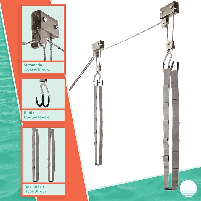 - FUNCTIONAL STORAGE - This pulley hoist will help you declutter your shed by providing safe garage ceiling storage, and the hooks feature a rubber coating to protect your kayaks, canoes, and other equipment from scratches.