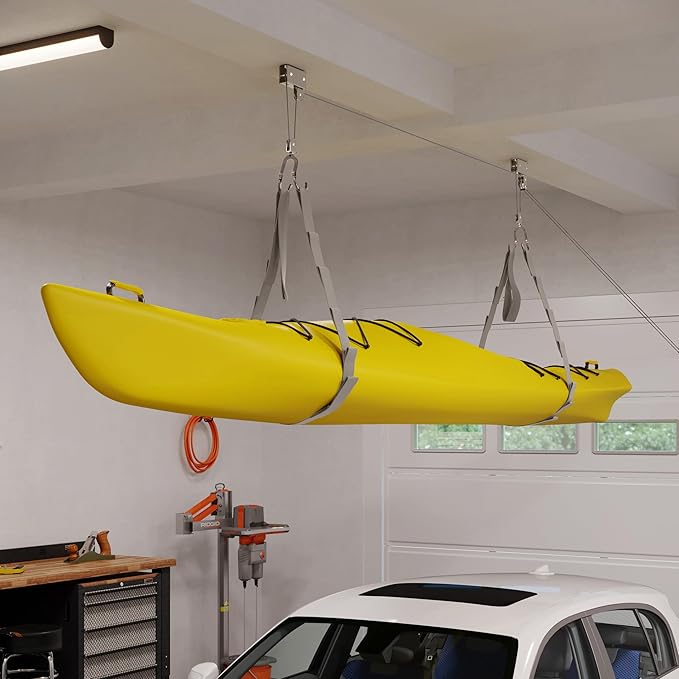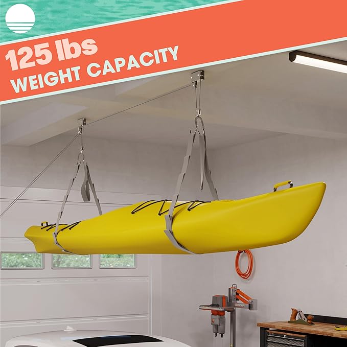 - KAYAK HOIST - The kayak hoist pulley system easily lifts and stores any style watercraft, bicycle, or ladder up to 125lbs overhead. The kayak hanger can accommodate many sizes of kayaks for convenient storage in your garage or shed.
