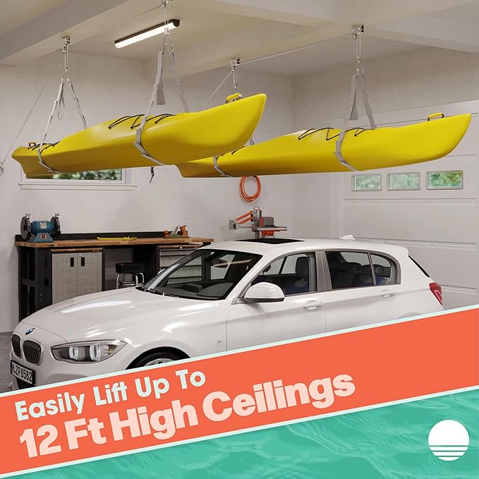 Kayak Storage Hoist - Overhead Pulley System with 125lb Capacity for Canoes, Bikes, Ladders, and More - for up to 12-Foot Ceilings