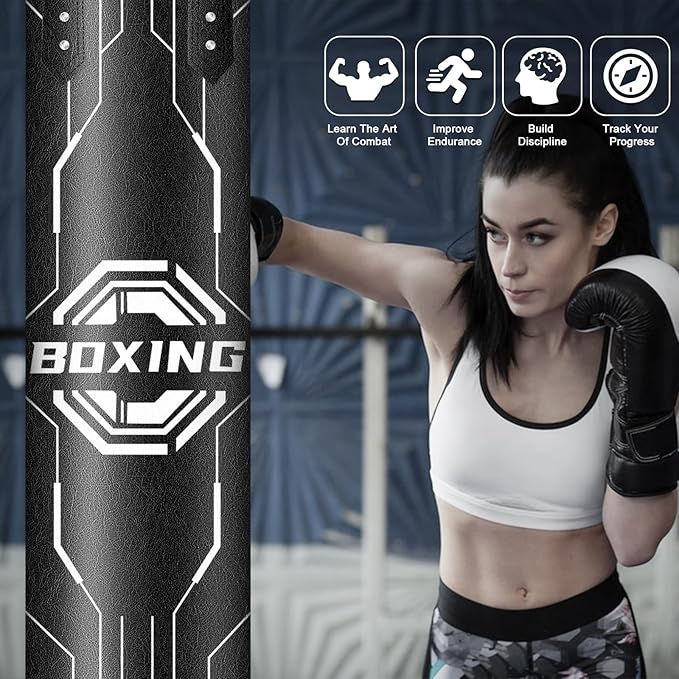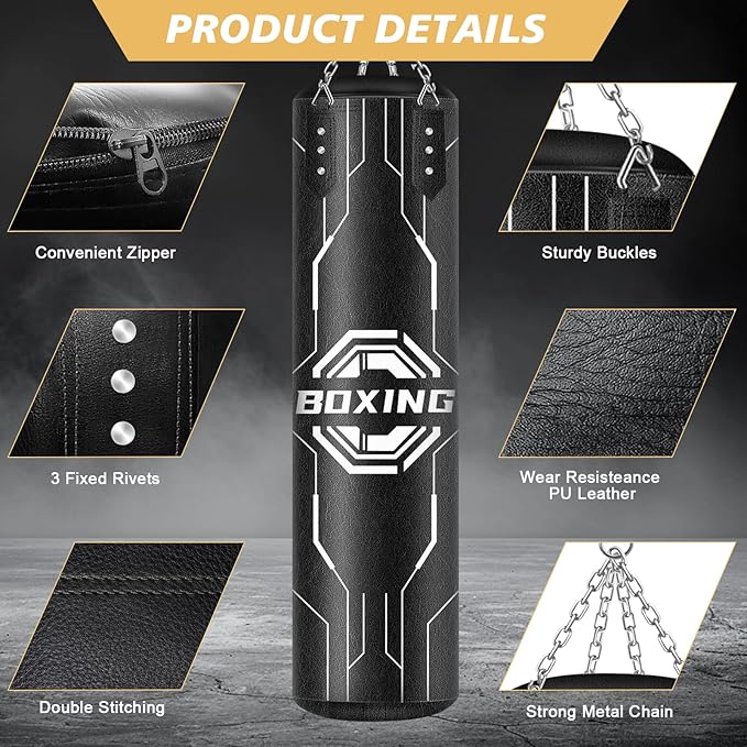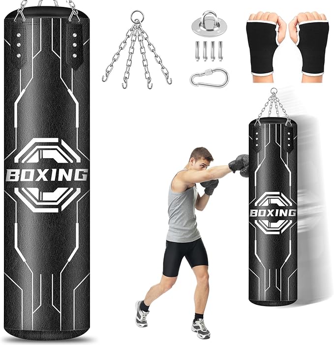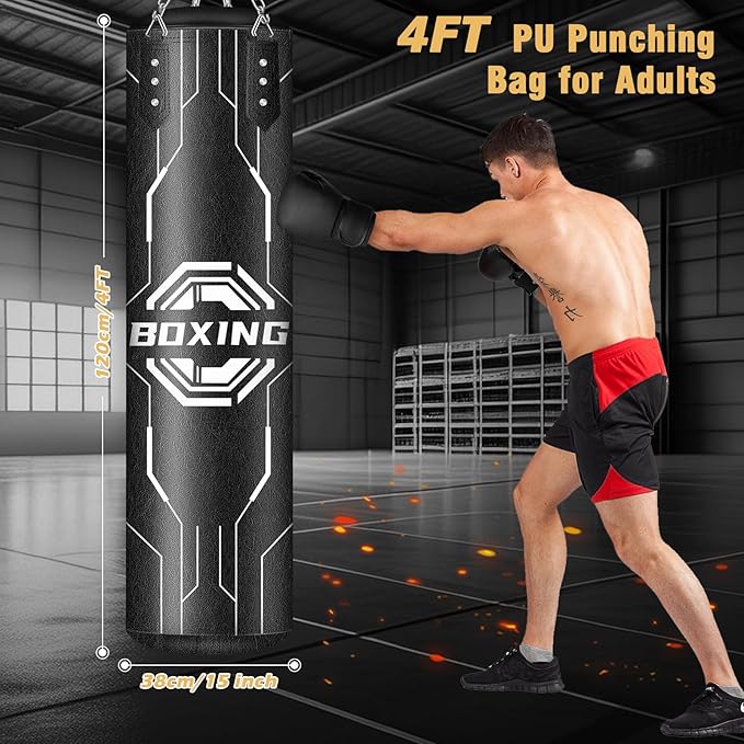 - Perfect Boxing Accessories Set: Our professional heavy punching bag set is perfect for boxing practice, includes 1 x 4FT unfilled punching bag for adults, 1 x 360° swivel hook, 1 x connecting carabiner, 4 x swivel stainless steel chains and 1 pair palm protector. Muay thai bag provides a full-body workout that helps you increase strength and power, build cardiovascular endurance, improve coordination, and reduce stress. Dimensions: 120cm/47.2‘’ long without chain, 35cm/13.8‘’ in diameter