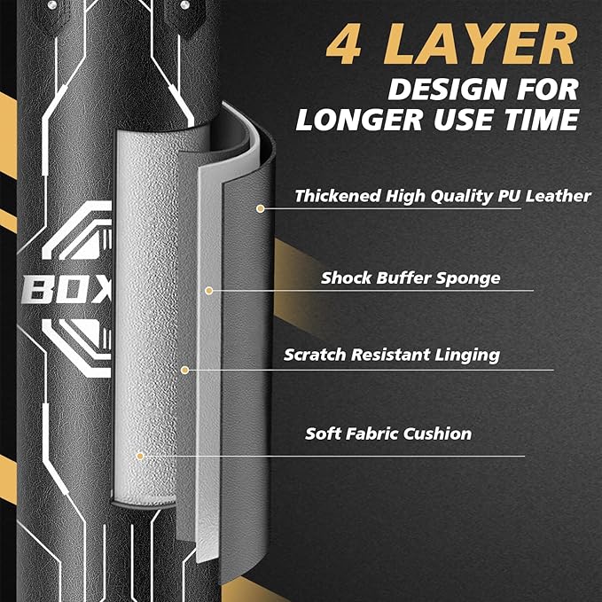 - Premium PU Leather: The boxing bags are made of high-quality microfiber PU leather, with a multi-layer structure and shock-absorbing foam padding design, which effectively reduces the impact generated during boxing and protects wrists and joints. Tear-resistant, wear-resistant, quick rebound, reinforced stitching can be used for a long time, providing a good boxing experience.Palm support provides excellent comfort and hand protection, Reduce the chance of wrist injury