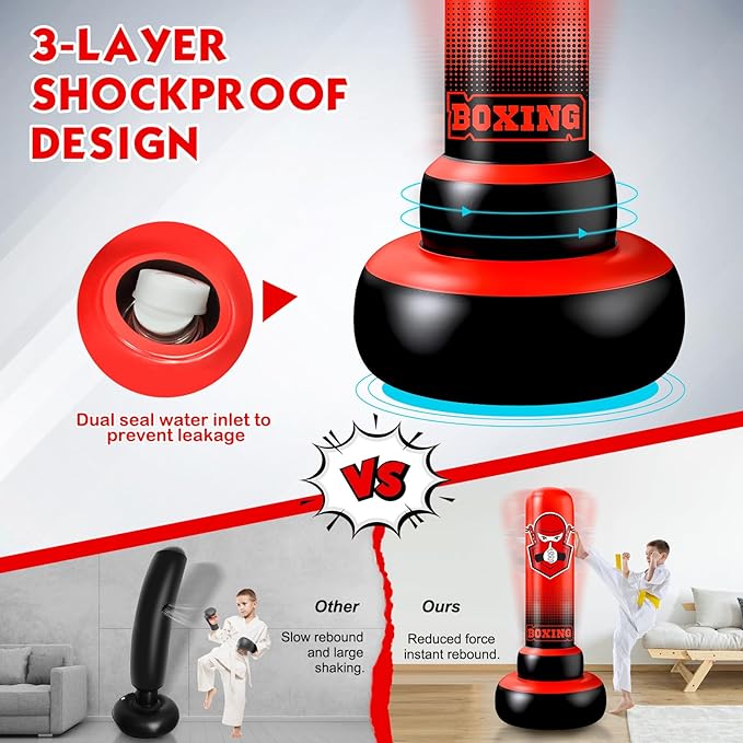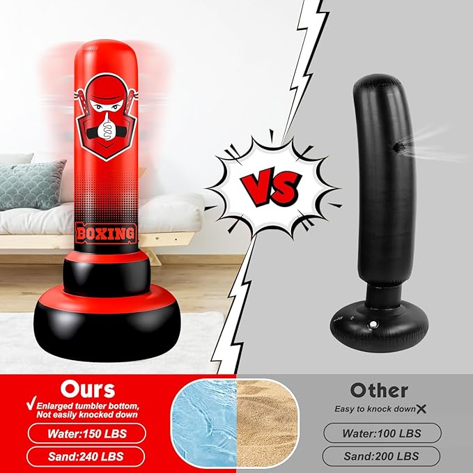 - 【Punching Bag for Kids】Our punching bag with a diameter of 27” at the bottom, the punching column is wider than most sandbags on the market, and the weight is more stable after adding water/sand. The freestanding boxing bag also upgrades the waist structure to enhance shock resistance.