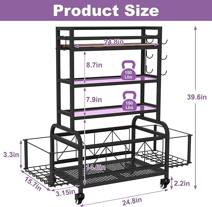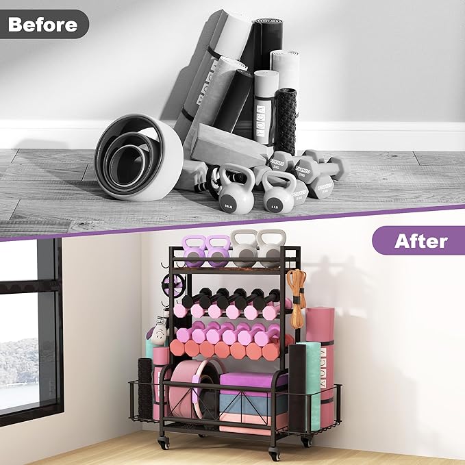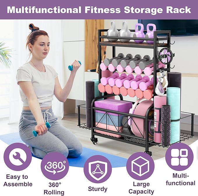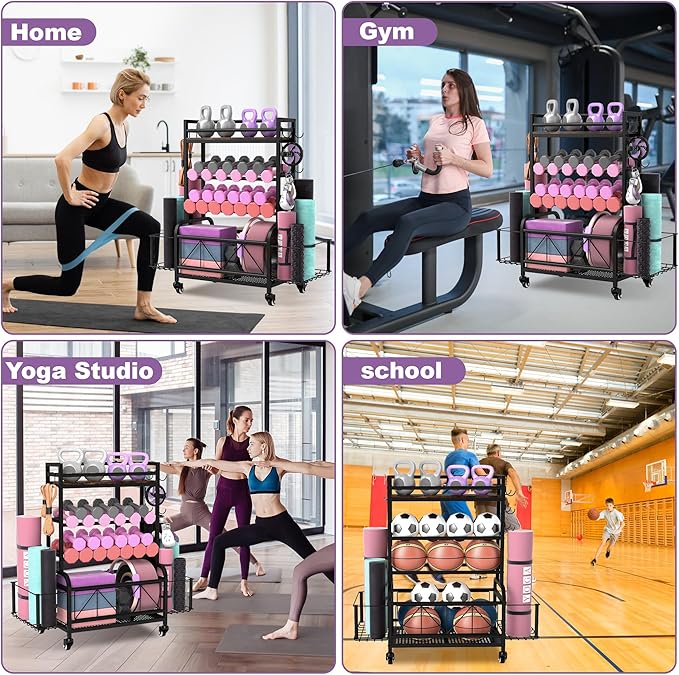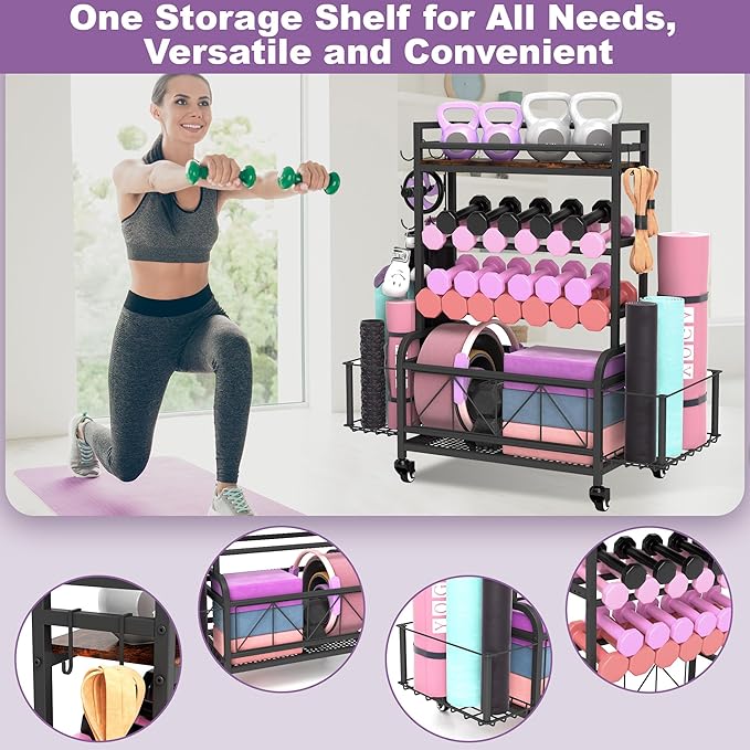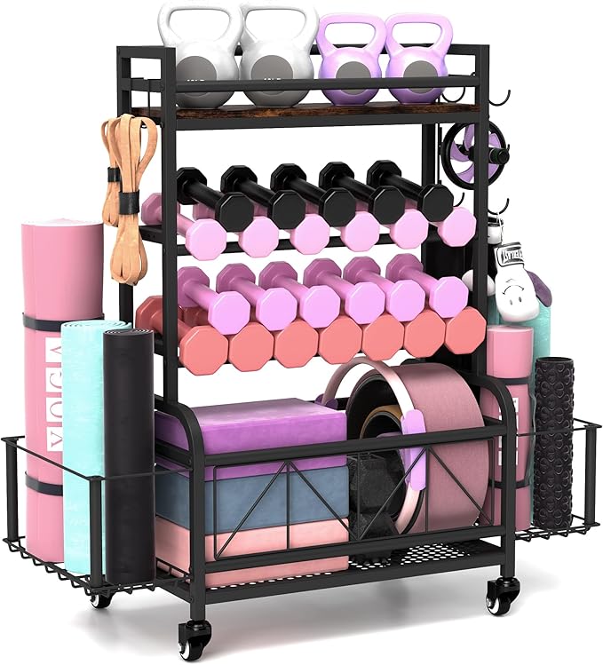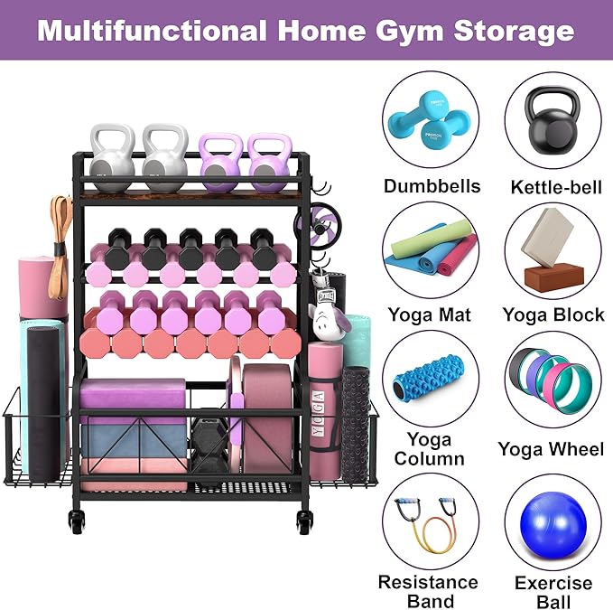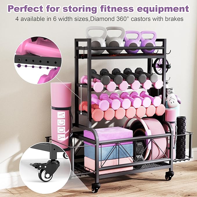 Dumbbell Rack, Home Gym Storage, Gym Storage Rack with Hooks and Wheels,Gym Equipment Storage,Weight Rack for Dumbbells for Organizing Yoga Mats, Kettlebells,Dumbbells, Foam Rollers and ball