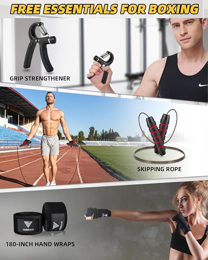 - 【Additional Fitness Tools】This set includes a skipping rope, which can improve cardiovascular fitness, enhance coordination, and aid in calorie burning. Also included is a grip strengthener, which is aimed at building hand and forearm strength for more powerful punches.