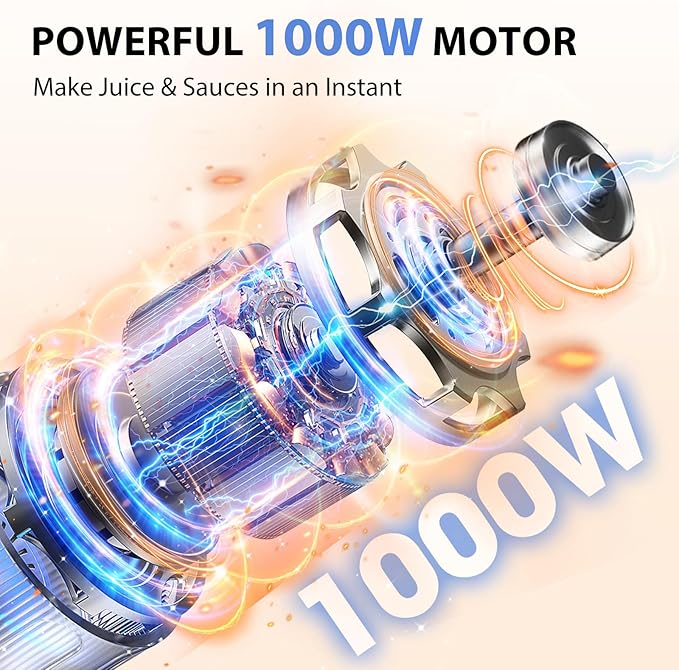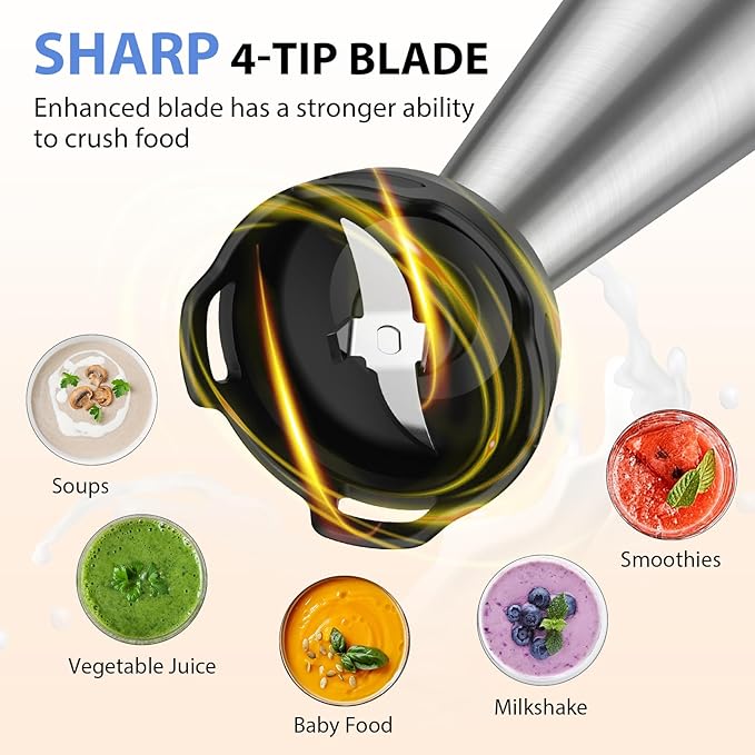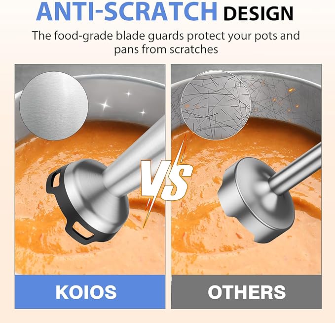 - 1000W Motor & 304 Stainless Steel 4-tip Blade: Compared with other 300-500W motors, upgraded KOIOS handheld blender is equipped with a 1000W all-copper motor, which is more powerful and has a stronger ability to crush food. With 304 food-grade stainless steel blades, this material has good oxidation resistance and high temperature resistance. Safe to use even in hot soup.